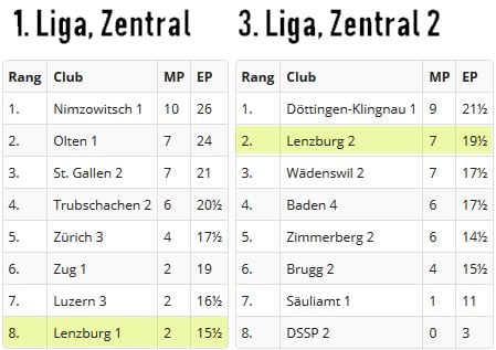 Lenzburg 1 kämpft nach der Niederlage gegen Zug 1 auf dem letzten Rang gegen den Abstieg, während Lenzburg 2 mit Zwischenrang 2 das Aufstiegsspiel im Visier hat.